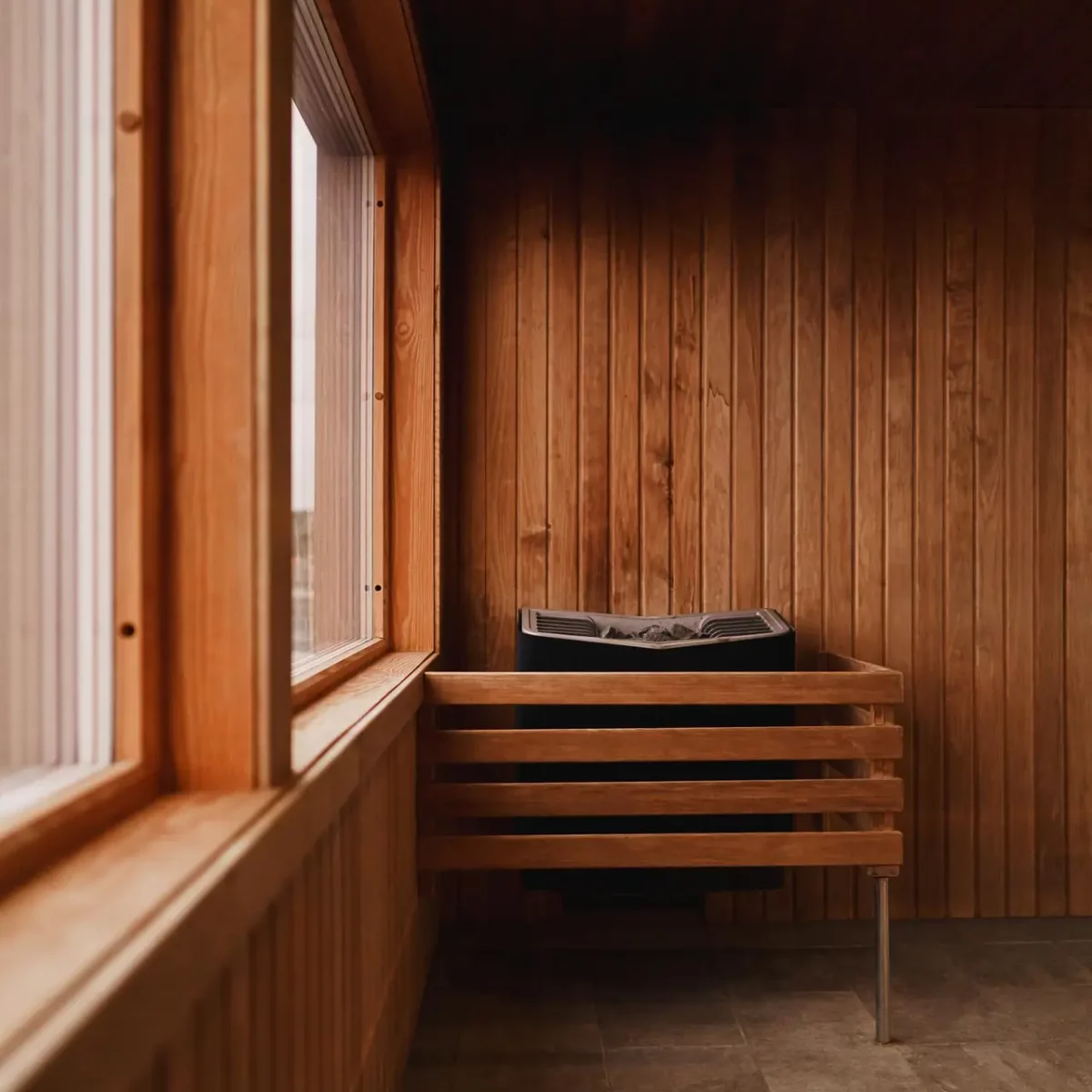 Holzsauna-Innenraum mit Fenster und elektrischem Ofen auf gefliestem Boden.